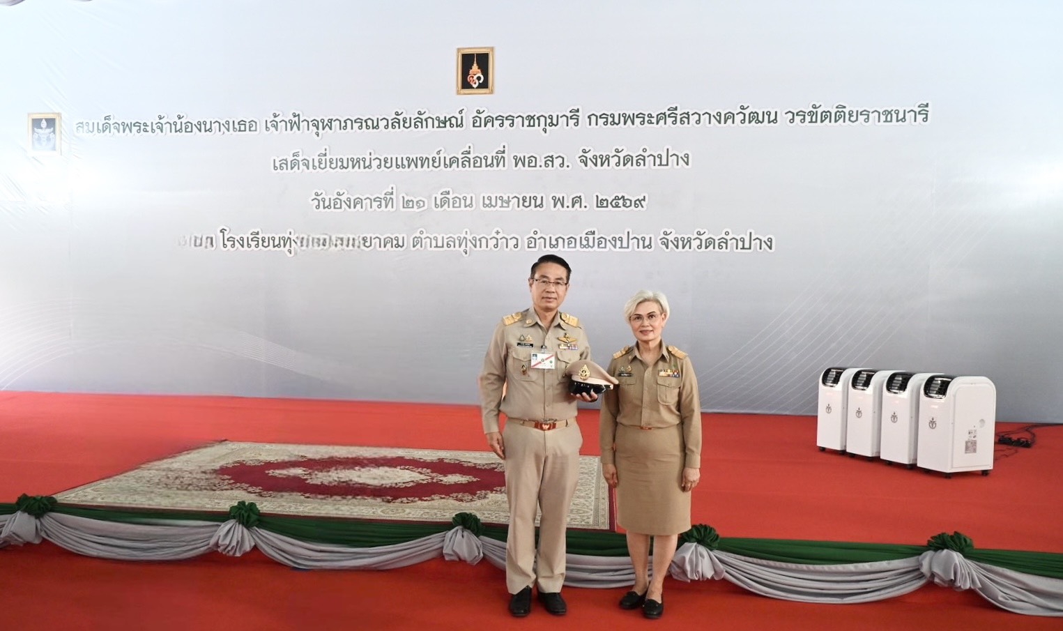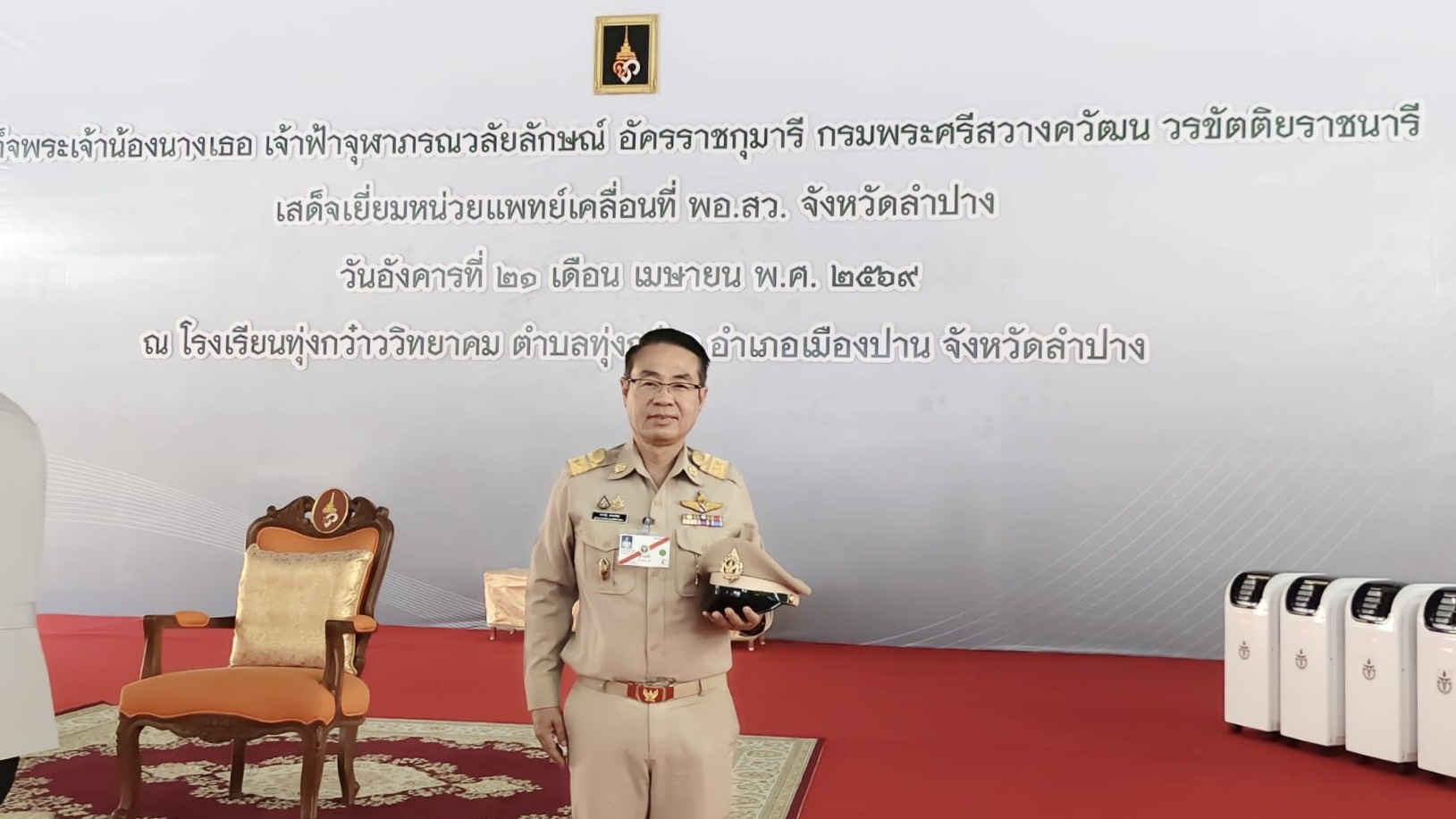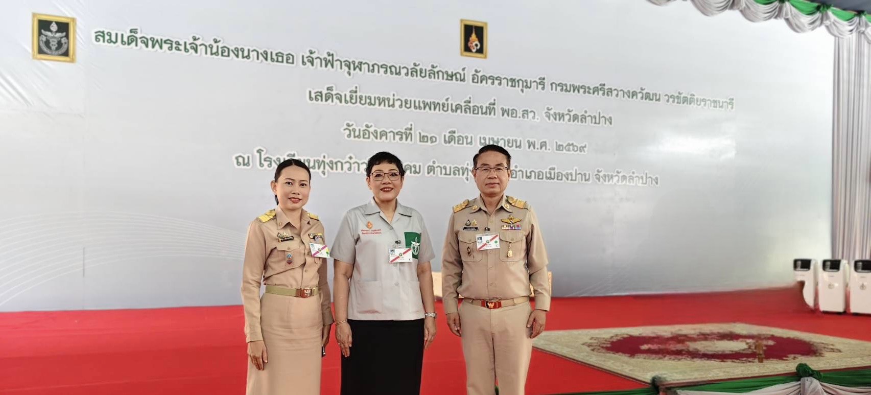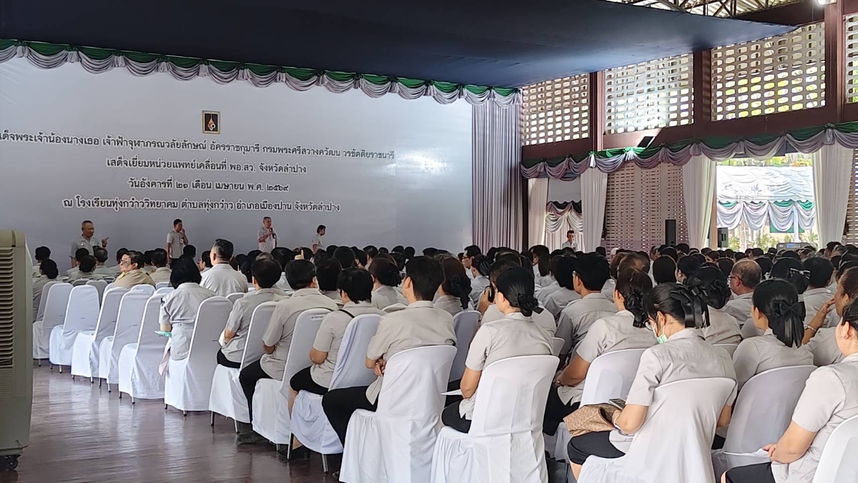 วันที่ 21 เมษายน 2569 เวลา 09.00 น. นายสยามรัฐ กุลประดิษฐ์ ผู้อำนวยการสำนักงานเขตพื้นที่การศึกษาประถมศึกษาลำปาง เขต 1 อนุกรรมการฝ่ายเลขานุการ รับเสด็จ สมเด็จพระเจ้าน้องนางเธอ เจ้าฟ้าจุฬาภรณวลัยลักษณ์ อัครราชกุมารี กรมพระศรีสวางควัฒน วรขัตติยราชนารี เสด็จเยี่ยมหน่วยแพทย์เคลื่อนที่ พอ.สว. และพระราชทานของที่ระลึกแก่กรรมการ อนุกรรมการ และอาสาสมัคร พอ.สว. ประจำจังหวัดลำปาง ณ หอประชุมโรงเรียนทุ่งกว๋าววิทยาคม ตำบลทุ่งกว๋าว อำเภอเมืองปาน จังหวัดลำปาง