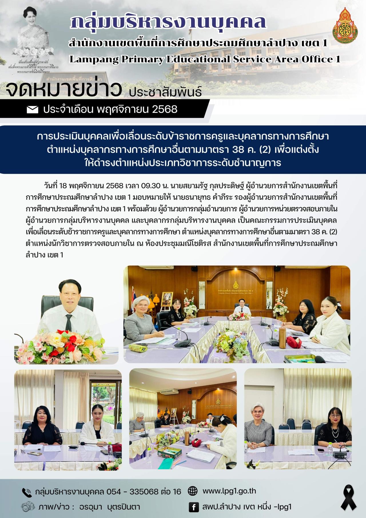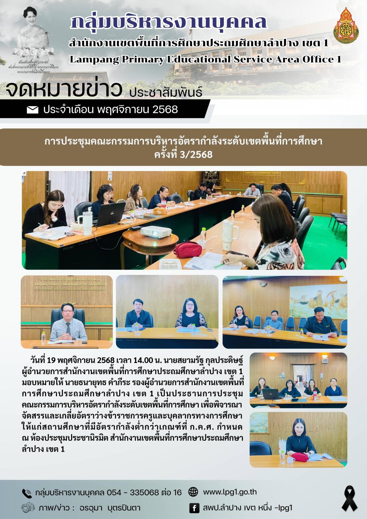 24 พฤศจิกายน 2568 วันที่ 24 พฤศจิกายน 2568 นายสยามรัฐ กุลประดิษฐ์ ผู้อำนวยการสำนักงานเขตพื้นที่การศึกษาประถมศึกษาลำปาง เขต 1 เข้าร่วมการประชุมคณะกรรมการ สกสค.จังหวัดลำปาง ประจำเดือน พฤศจิกายน 2568 โดยมี ดร.หัทกาญจน์ อดุลถิรเขตต์ ...