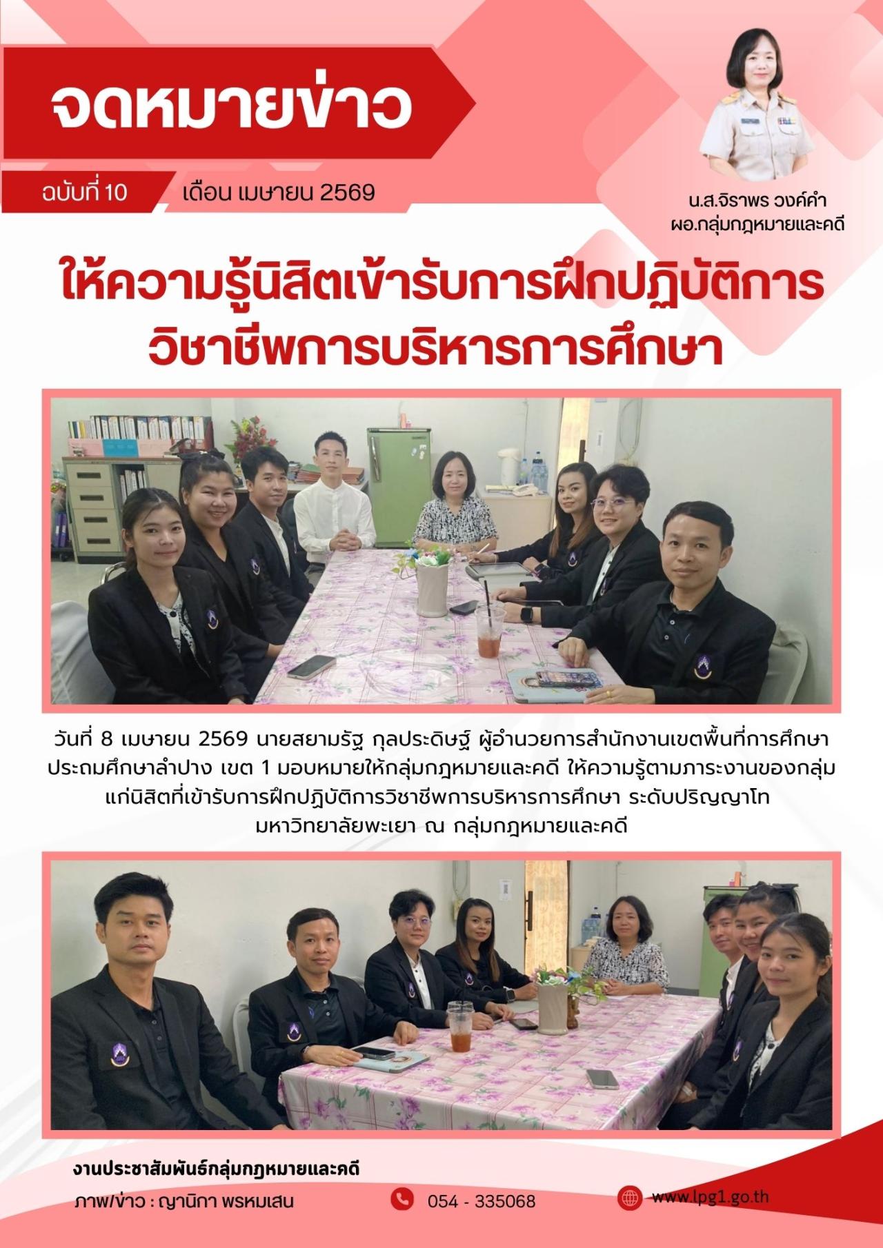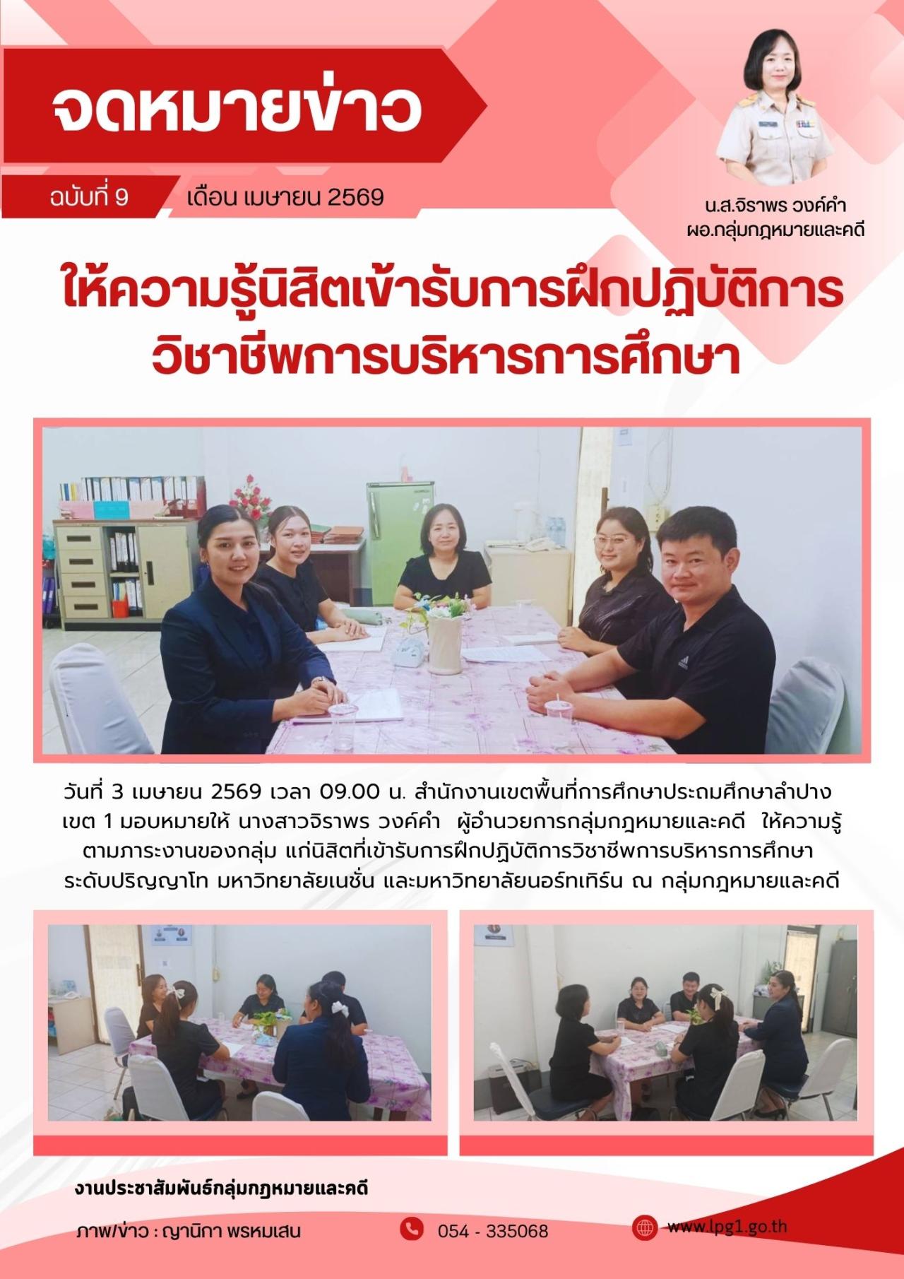 03 เมษายน 3112 วันที่ 3 เมษายน 2569 เวลา 09.00 น. สำนักงานเขตพื้นที่การศึกษาประถมศึกษาลำปาง เขต 1 มอบหมายให้ นางสาวจิราพร วงค์คำ ผู้อำนวยการกลุ่มกฎหมายและคดี ให้ความรู้ตามภาระงานของกลุ่ม แก่นิสิตที่เข้ารับการฝึกปฏิบัติการวิชาชีพ...