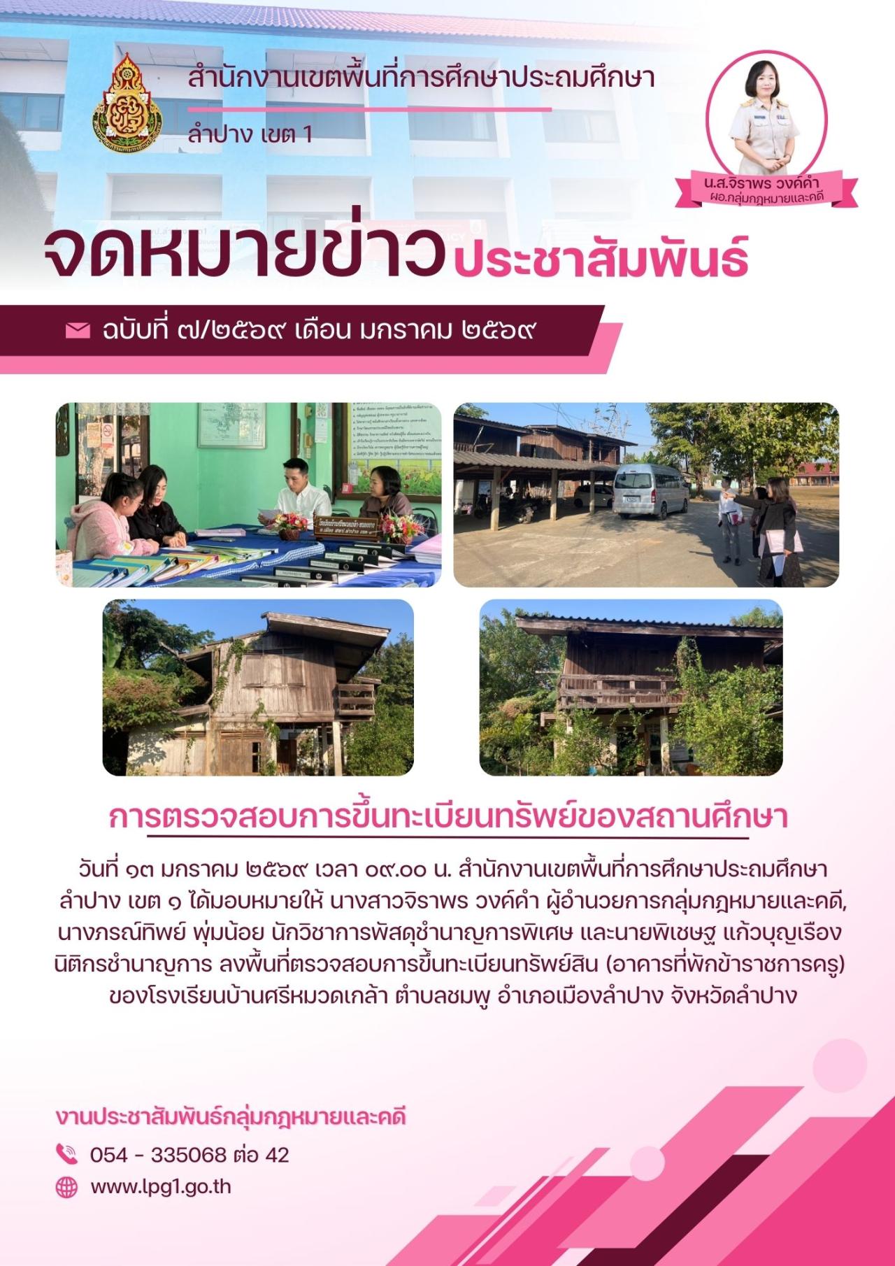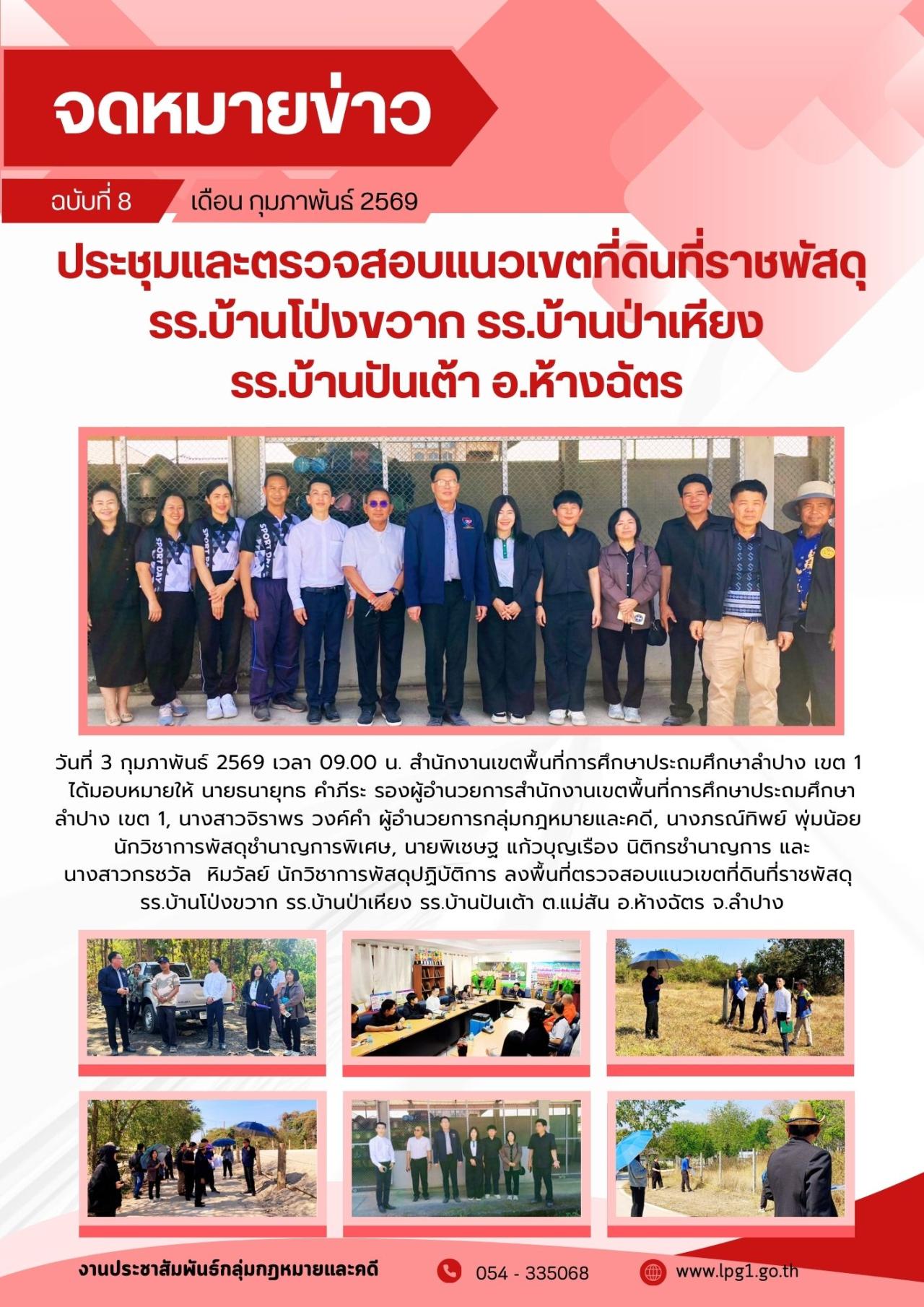13 มกราคม 2569 วันที่ ๑๓ มกราคม ๒๕๖๙ นายสยามรัฐ กุลประดิษฐ์ ผู้อำนวยการสำนักงานเขตพื้นที่การศึกษาประถมศึกษาลำปาง เขต ๑ มอบหมายให้ นางสาวจิราพร วงค์คำ ผู้อำนวยการกลุ่มกฎหมายและคดี และนายพิเชษฐ แก้วบุญเรือง นิติกรชำนาญการ ลงพื้นที...