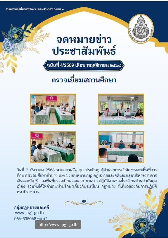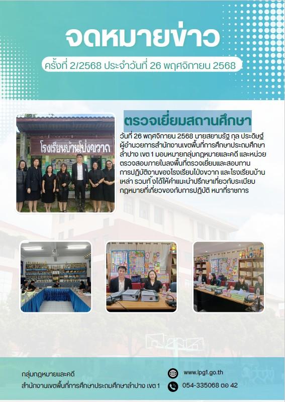 27 พฤศจิกายน 2568 วันที่ 27 พฤศจิกายน 2568 นายสยามรัฐ กุลประดิษฐ์ ผู้อำนวยการสำนักงานเขตพื้นที่การศึกษาประถมศึกษาลำปาง เขต 1 มอบหมายกลุ่มกฎหมายและคดี และหน่วยตรวจสอบภายในลงพื้นที่ตรวจเยี่ยมและสอบทาน การปฏิบัติงานของโรงเรียนนิคมพัฒนา...