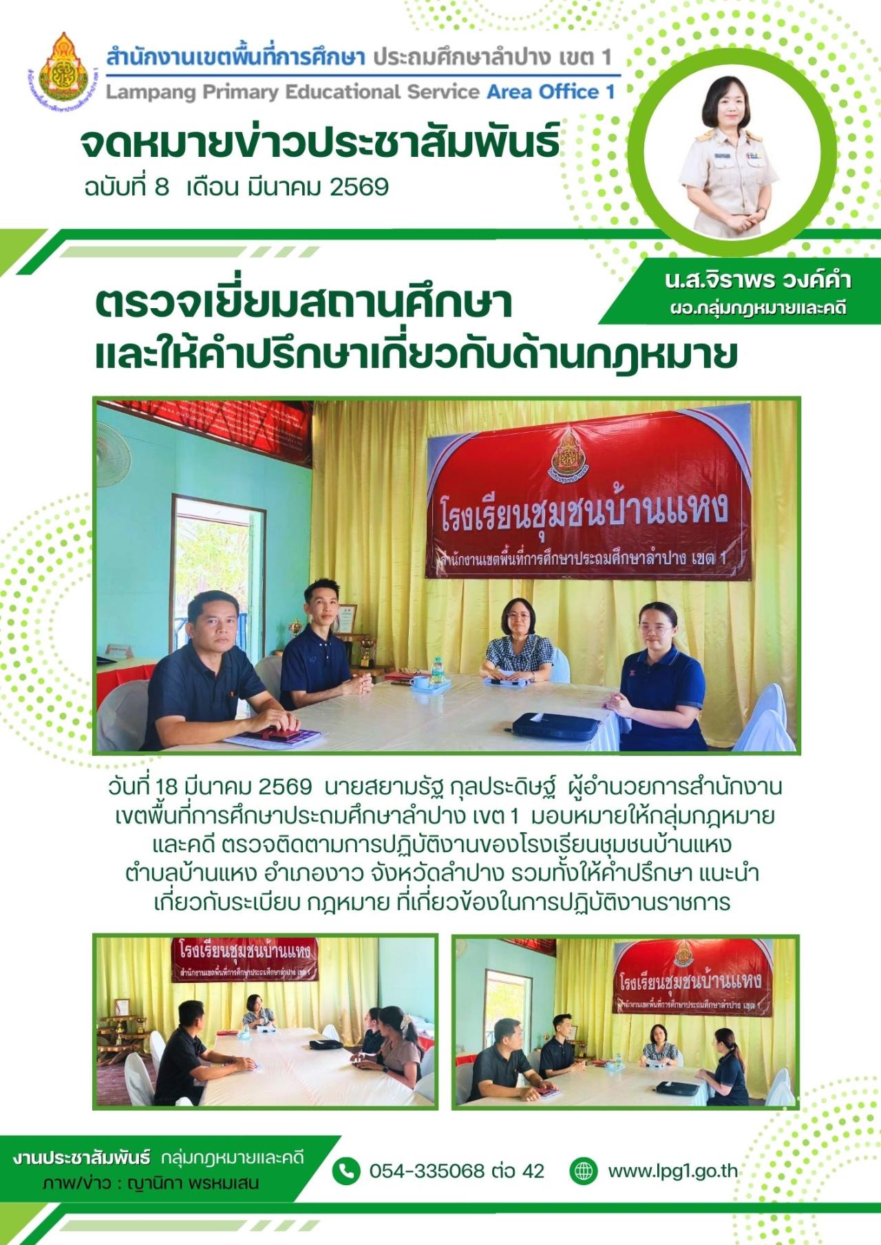 18 มีนาคม 2569 วันที่ 18 มีนาคม 2569 นายสยามรัฐ กุลประดิษฐ์ ผู้อํานวยการสํานักงานเขตพื้นที่การศึกษาประถมศึกษาลําปาง เขต 1 มอบหมายให้กลุ่มกฎหมายและคดี ตรวจติดตามการปฏิบัติงานของโรงเรียนชุมชนบ้านแหง ตำบลบ้านแหง อำเภองาว จังหวัด...