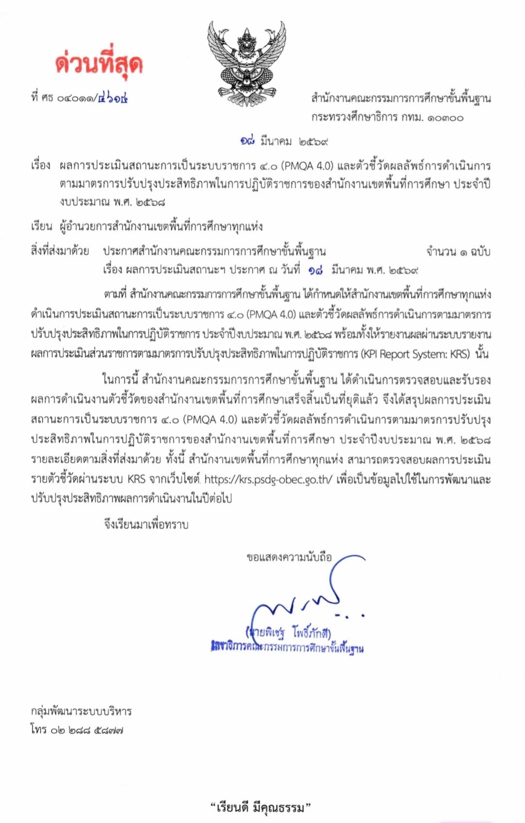 20 มีนาคม 2569 ผลการประเมิน (PMQA) และ KRS ประจำปีงบประมาณ 2568